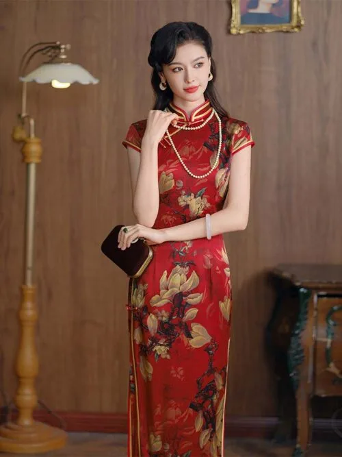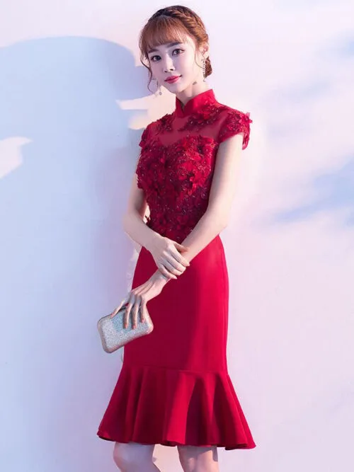Burgundy red short cheongsam wedding dress fishtail