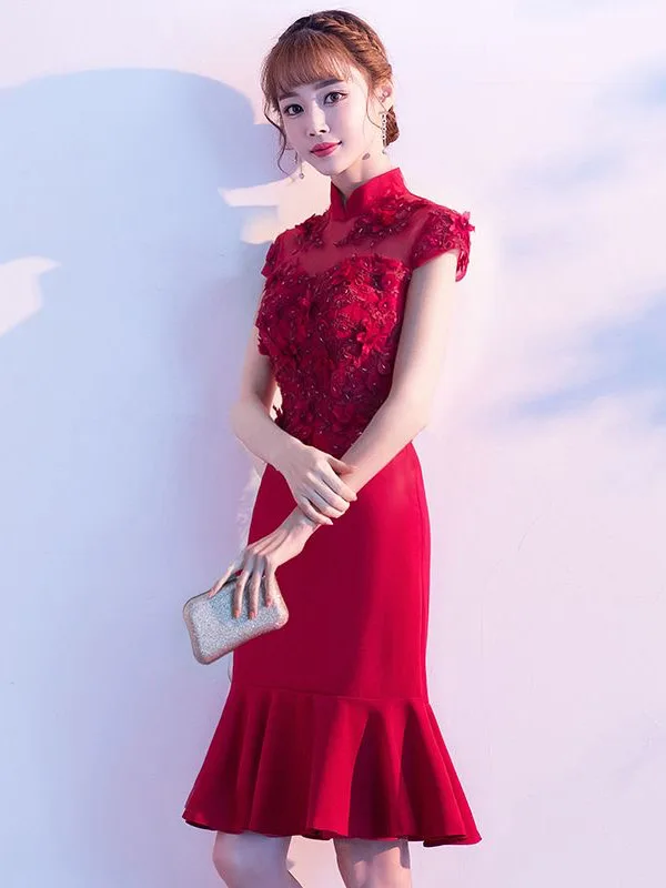 Burgundy qipao wedding gown Split Long Cheongsam fishtail