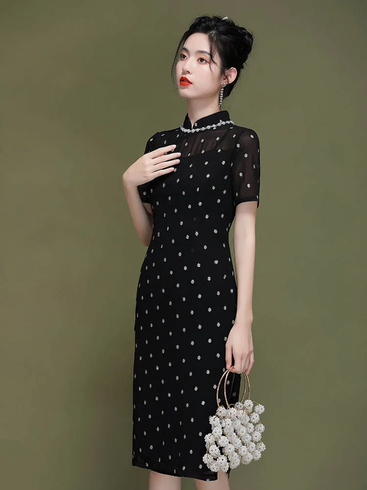 Black oriental dress, cotton and linen embroidered Cheongsam